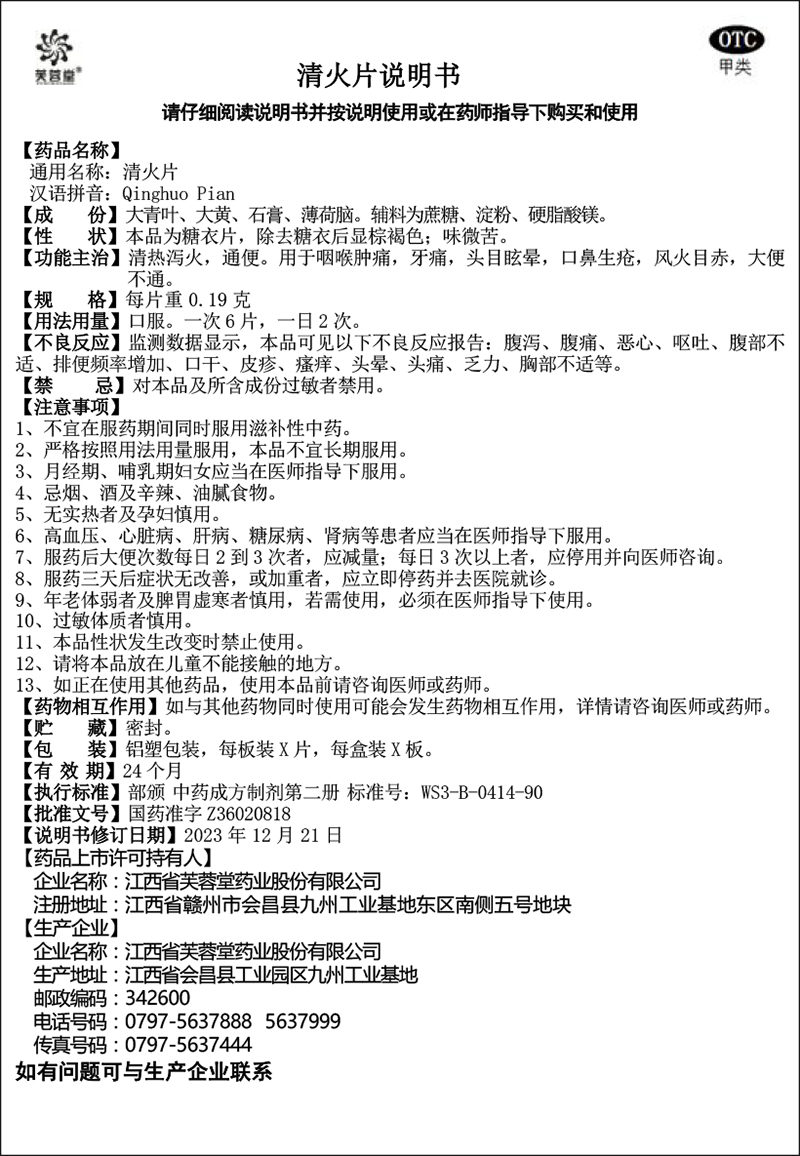 根据国家药监局关于修订清火片和清火胶囊说明书的公告(2023年第156号),我公司于2023 年12月 21日向江西省药监局进行了清火片(糖衣)和清火片(薄膜衣)修订说明书的备案。由于国家局公告要求药品上市许可持有人应当在备案后9个月内对已出厂的药品说明书及标签予以更换,为此,公司请求各清火片经销客户对未销售完的产品进行更换新的说明书,我公司可以寄送说明书给您处或者把产品退回我司进行说明书更换。敬请配合支持!同时将新版说明书的样稿附在公司官网,以便客户和消费者在使用时阅读。